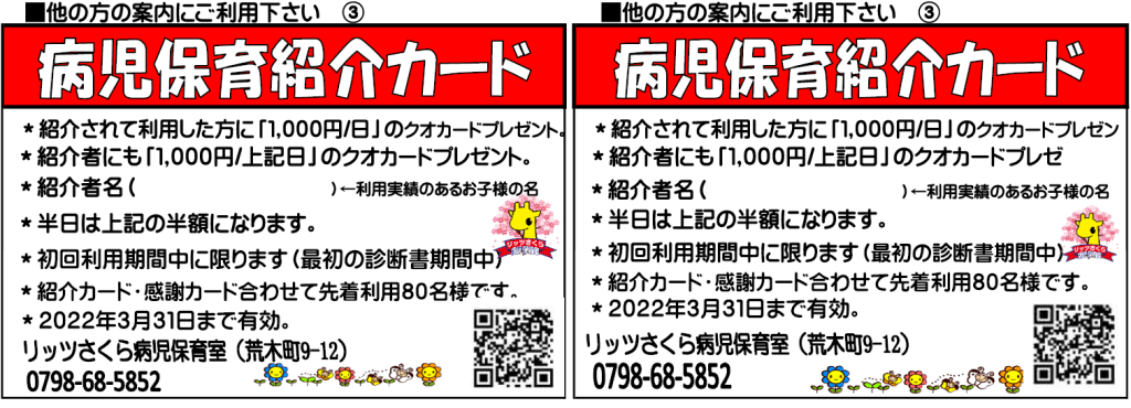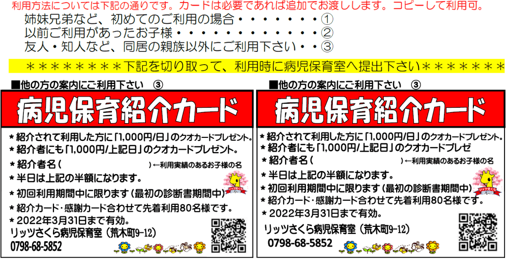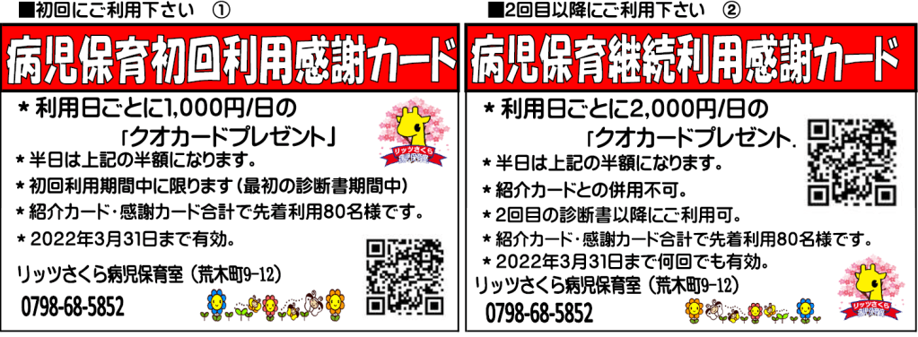 常日頃は「リッツさくら病児保育室」に、ご理解とご協力を賜り厚く御礼申し上げます。さてこの度、働く保護者様へのより一層の支援を強めたく、病児保育に関しての「紹介企画」と「利用感謝企画」を期間限定にて実施いたします。
