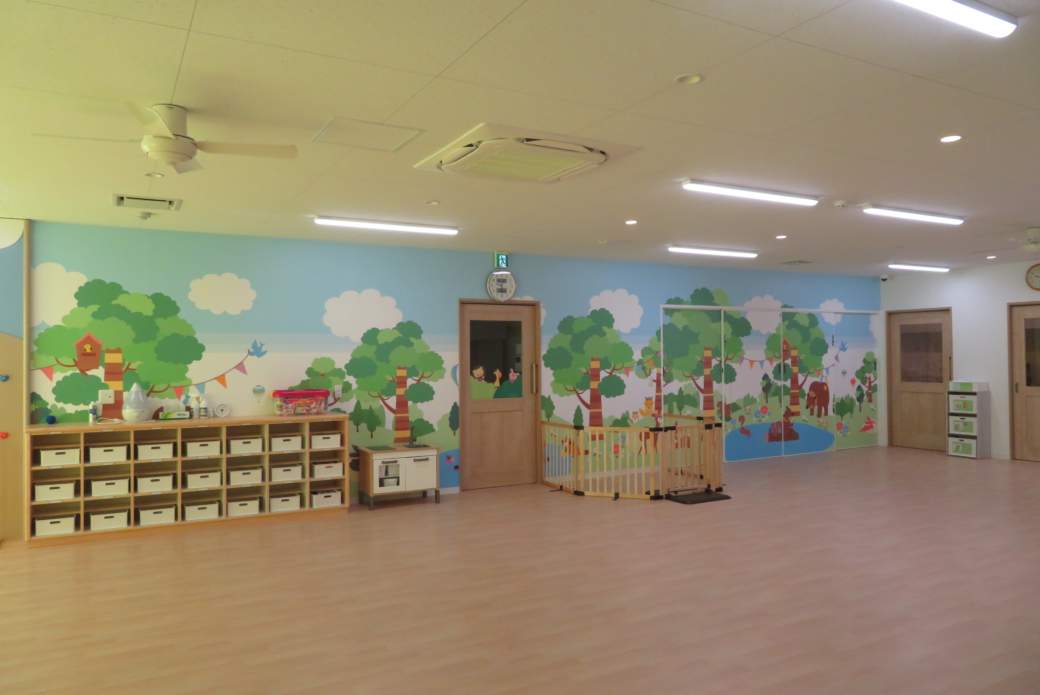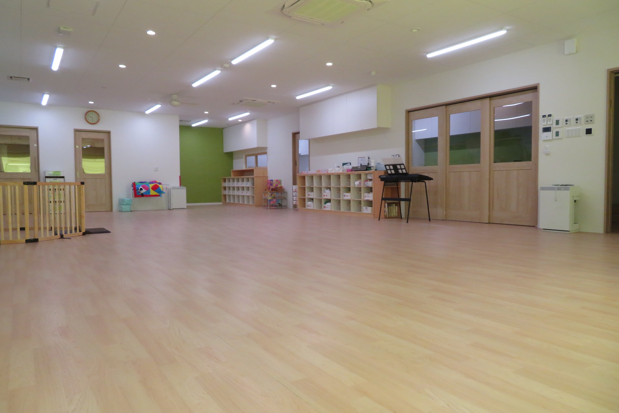 可動式の仕切りを設置し、全体の活動も年齢ごとの活動も安全に行える空間を作っています。