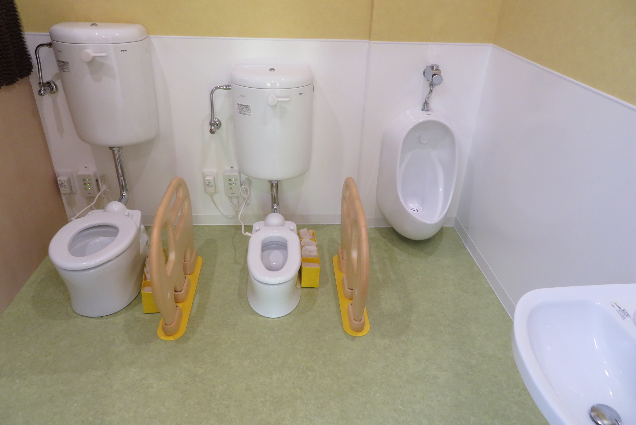 トイレタイムに並んで急かされて用を足すのではなく、オムツが外れやすいようにゆったりとした時間をかけたトイレタイムにする為に二種の年齢層に分けてあります。