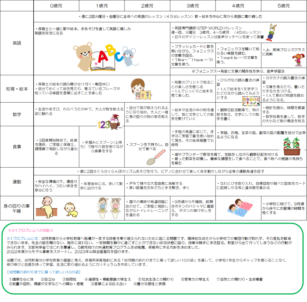 当園が掲げる保育目標は「小学校へあがったときキラキラと輝ける子供」に育てる事です。それには生きる力の基礎となる自立・集団行動・自己発信能力の他に読み・書き・計算など、小学校へあがったときに自信を持ってやっていけるように指導していきます。ご父兄の一番心配している「保育園育ちは習い事をさせれない」を十分補い、小学校へ送り出します。